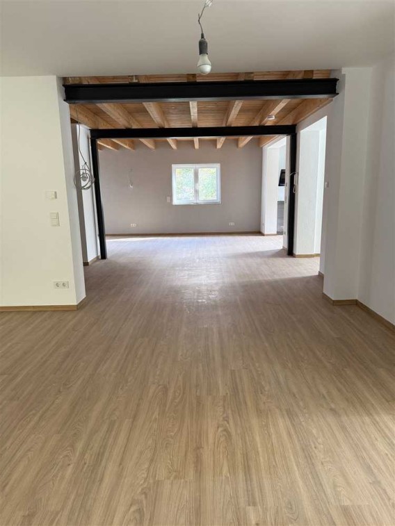Der gesamte Wohn-, Ess- und Kochbereich mit ca. 76 m² ist das Herzstück der Wohnung. Die Fläche ist architektonisch durchdacht in Funktionszonen gegliedert und bietet viel Raum für anspruchsvolle Wohnbedürfnisse. Besonderes Highlight: teilweise sichtbare Holz- und Stahlträger im Deckenbereich, die dem Ensemble einen einzigartigen Loftcharakter verleihen.