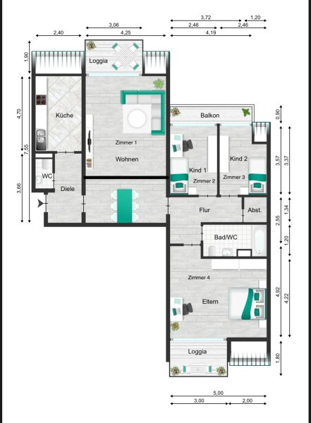 • Zimmer 4 (groß + Loggia): 660 € kalt / 90 € NK / 750 € warm