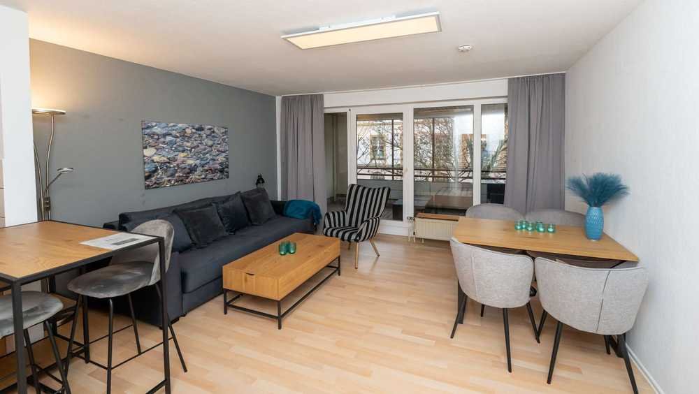 Ein Highlight der Wohnung ist der überdachte Balkon: Auf der gemütlichen Sitzgarnitur können Sie hier Ihren Morgenkaffee genießen oder den Abend bei frischer Luft ausklingen lassen – dank Überdachung sogar bei regnerischem Wetter. Diese Wohnung bietet Ihnen einen Rückzugsort mitten in der Stadt, ohne auf Komfort und Gemütlichkeit zu verzichten.