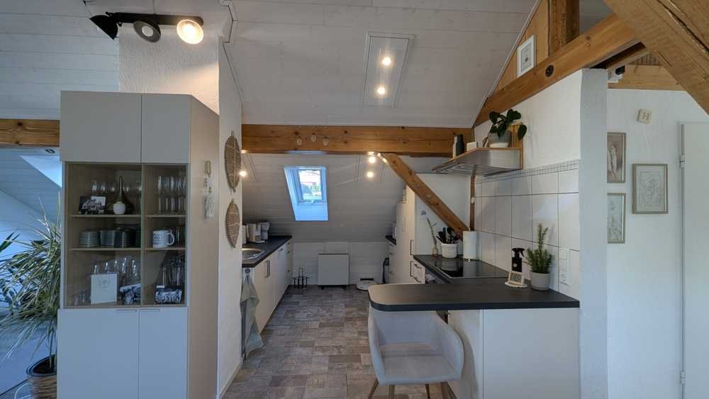 � Lichtdurchflutete Dachgeschosswohnung mit sichtbaren Holzbalken und Süd-Balkon. Die Wohnung verfügt über eine kompakt geschnittene Wohnfläche von 48 m², die dank der offenen Gestaltung besonders großzügig wirkt. Die Räumlichkeiten sind vollständig mit hochwertigen Möbeln ausgestattet. Zusätzlich stehen zwei große Kellerräume mit insgesamt 23 m² zur Verfügung, die als Büro und Waschküche genutzt werden können.