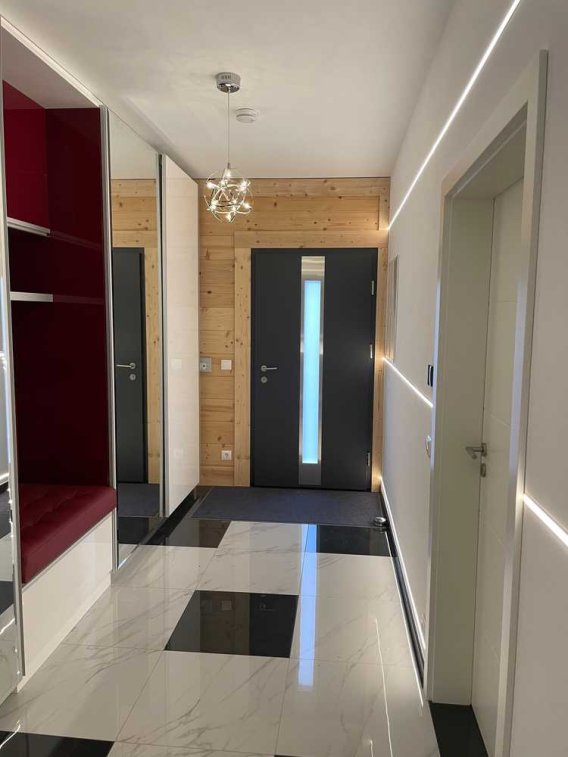 Das Haus überzeugt durch Architektur und energiesparenden, umweltfreundlichen Holzbau kombiniert mit einem speziellen Stahlbetonträgersystem. Es ist energieeffizient ausgebaut und erfüllt KfW 40 Anforderungen. Mit den mehrschichtig verleimtes Massivholz-Innenwände 8 cm , hohem Deckenniveau und ausreichend Tageslicht durch die bodentiefe Fenster und eine Öffnung über die 4 Ebene bietet das Haus viel Gemütlichkeit , einzigartige Atmosphäre und höchste Lebensqualität an.
