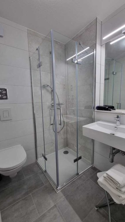 • Bad mit großer Dusche, Waschbecken und modernen Wand- & Bodenfliesen