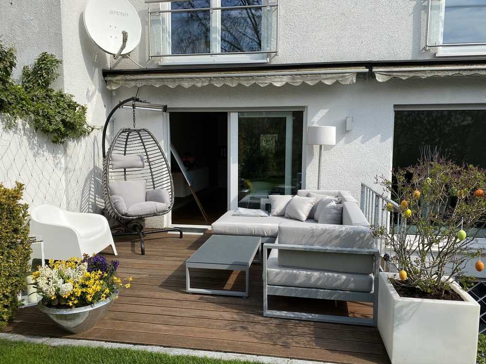 Der ruhig gelegene Garten hat Feldrandblick, verfügt über eine Holzterrasse mit Sitzgruppe, welche über das Wohn/Esszimmer mit einer Schiebetür zu erreichen ist. Es gibt eine Magnolie, einen Japanischen Ahorn und Johannisbeersträucher. Im hinteren Gartenteil befindet sich ein separater Essplatz im Schatten mit 6 Stühlen und Tisch.