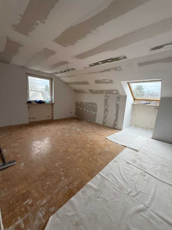 Die Wohnung wird im Winter 2025/2026 komplett saniert und neue Böden verlegt. Das Wohnzimmer ist mit einem Echtholzparkett ausgestattet. Die Bilder zeigen eine Übersicht über die Zimmer während der Renovierung im Dezember 2025.