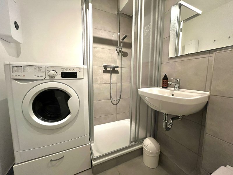 Die Wohnung verfügt über eine Wohnfläche von ca. 27 qm, einen Balkon zum Innenhof und wurde 2024 komplett saniert. Das Badezimmer ist mit einem 2025 angeschafften Waschtrockner (nicht auf dem Foto) ausgestattet. Die Küche verfügt über eine Doppel-Induktionskochplatte.