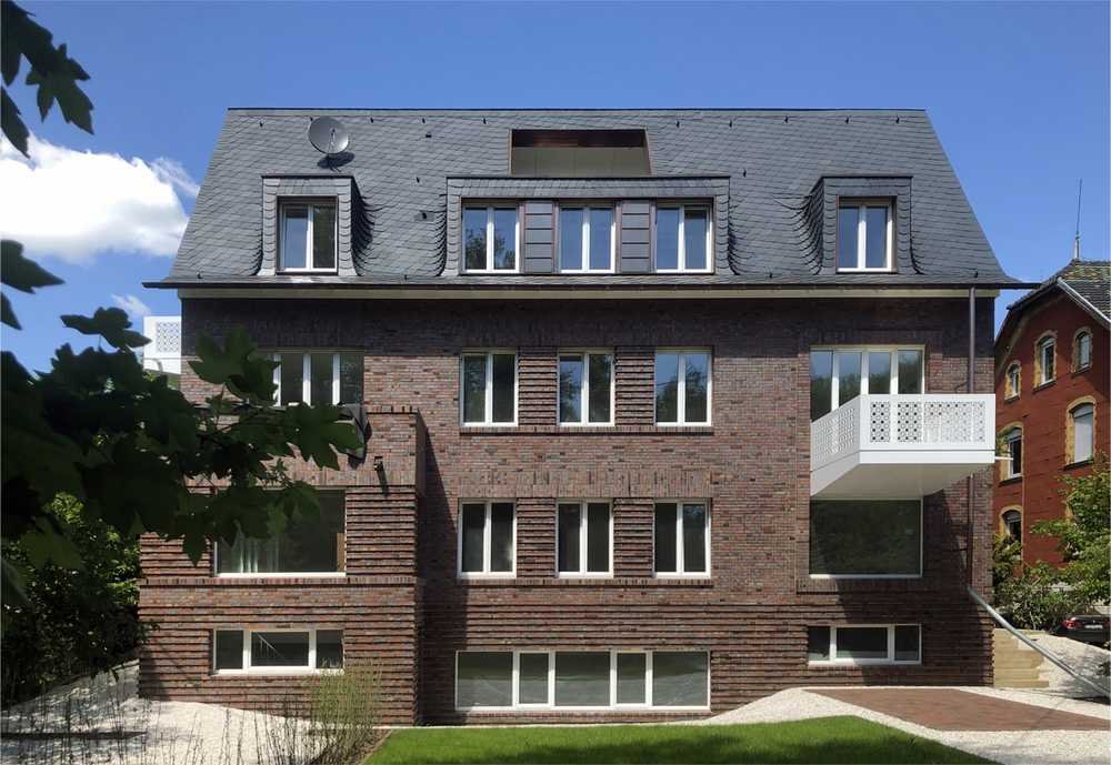 Diese hochwertige Wohnung befindet sich in einem neu errichteten, sehr repräsentativen 6-Familienhaus, das unweit des Ortscentrums von Kreuztal gelegen ist. Das Haus hat eine rote Backsteinfassade, ein klassisches ortstypisches Schieferdach und Holzfenster.