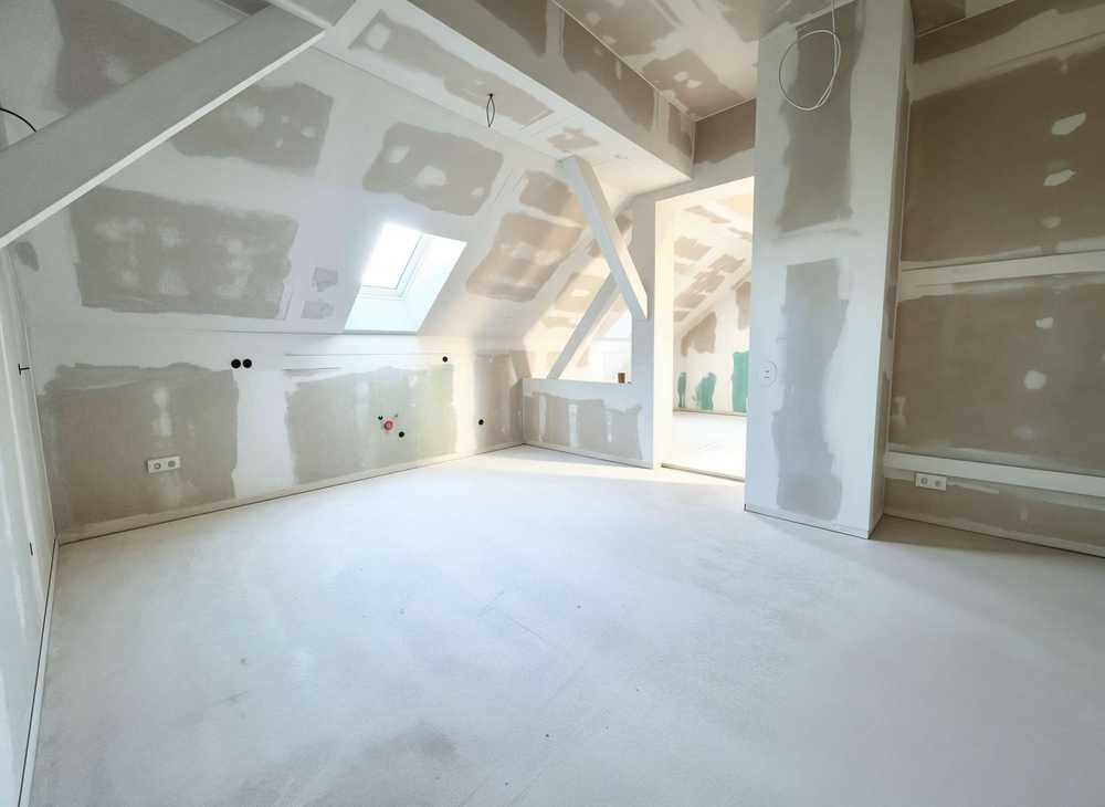 Das geräumige Schlafzimmer mit ca. 14,56 m² bietet ausreichend Platz für ein großes Bett und einen Kleiderschrank. Ein Dachflächenfenster sorgt hier für eine angenehme, helle Atmosphäre.