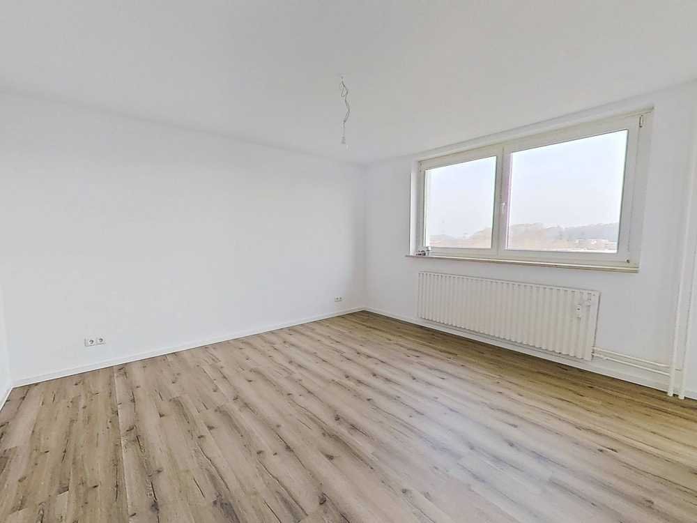 Auch das Schlafzimmer bietet viel Platz zur individuellen Gestaltung. Ein Boden in Holzoptik, der sich auch im Wohn- und Esszimmer sowie dem Flur befindet, verleiht dem Raum eine warme Atmosphäre.