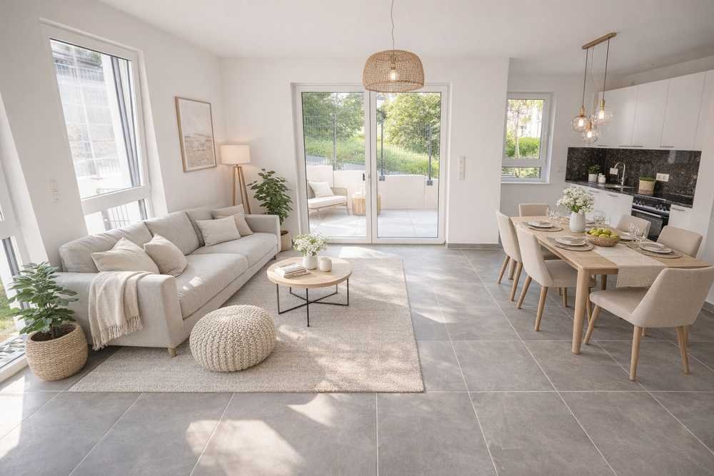 Das Herzstück der Wohnung bildet der offene Wohn- und Essbereich mit moderner Einbauküche. Von hier aus gelangen Sie direkt auf die sonnige Süd-West-Terrasse, die zu entspannten Stunden im Freien einlädt. Ergänzend stehen Ihnen ein separates Gäste-WC sowie eine praktischer Abstellraum innerhalb der Wohnung zur Verfügung sowie zwei flexibel nutzbare Schlafzimmer.