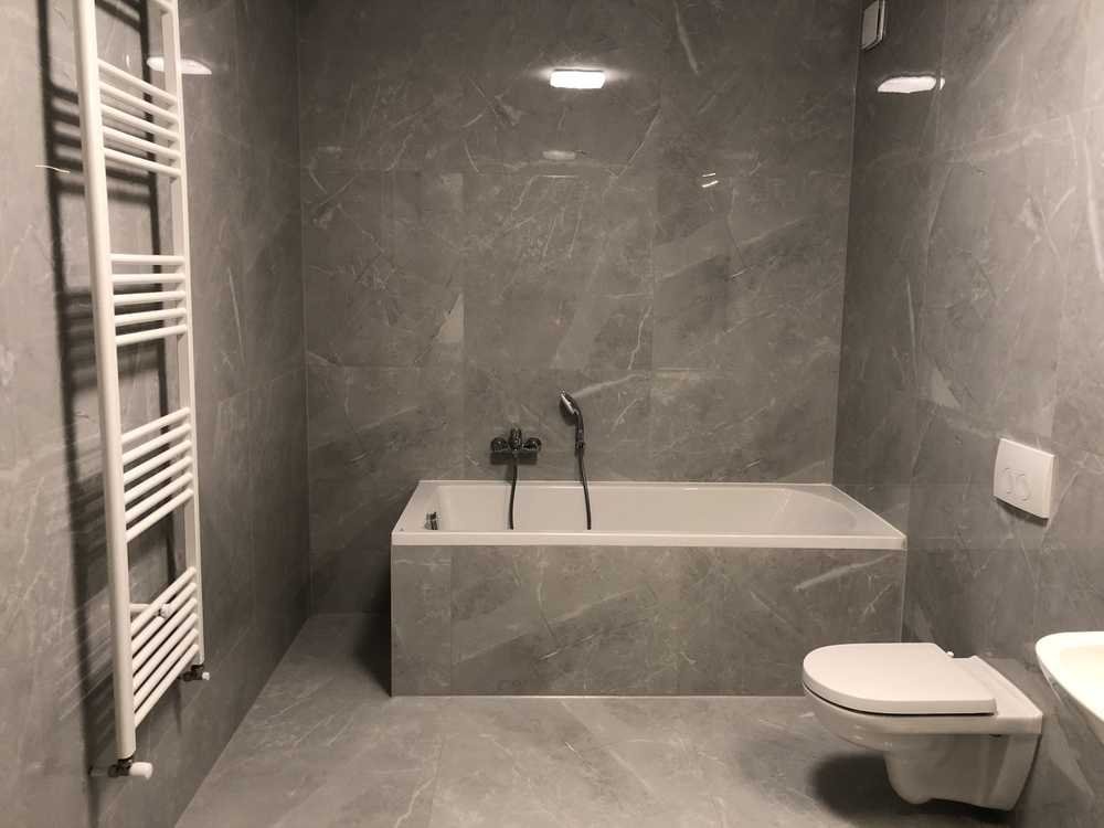 Die Wohnung überzeugt durch eine hochwertige Ausstattung und eine großzügige Raumwirkung. Das Badezimmer ist mit Badewanne und separater Dusche ausgestattet. Verbaut wurden Großformatfliesen, hochwertige Badkeramik von Villeroy & Boch sowie Armaturen von Grohe.