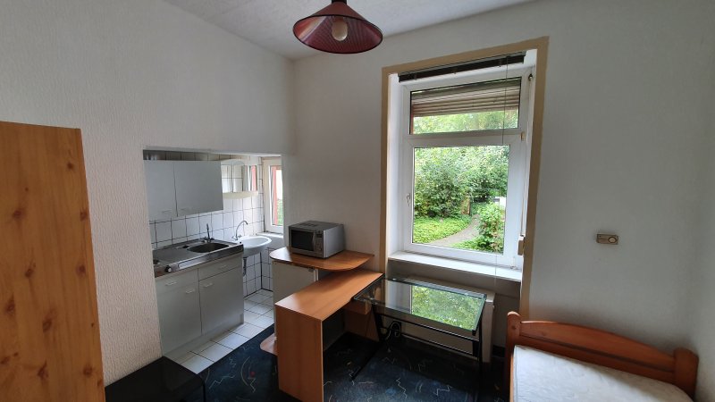 Das schöne Zimmer ist teilmöbliert mit Schrank, Tisch, Stuhl und Bett sowie weiteren Möbeln, zusammen mit einer Kochnische mit Herd und Spüle. Ein Waschbecken ist ebenfalls vorhanden.