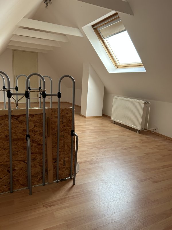 Die Dachgeschosswohnung besteht aus einem Wohnbereich mit angeschlossener Küche, zwei Schlafzimmer, einem Bad und einem ausgebauten Dachboden.
